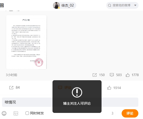 徐杰因这一风波频频登上微博热搜。有网友发现,徐杰的个人社媒开启了防护模式,其微博是仅博主关注人可评论,dy则是不可评论。