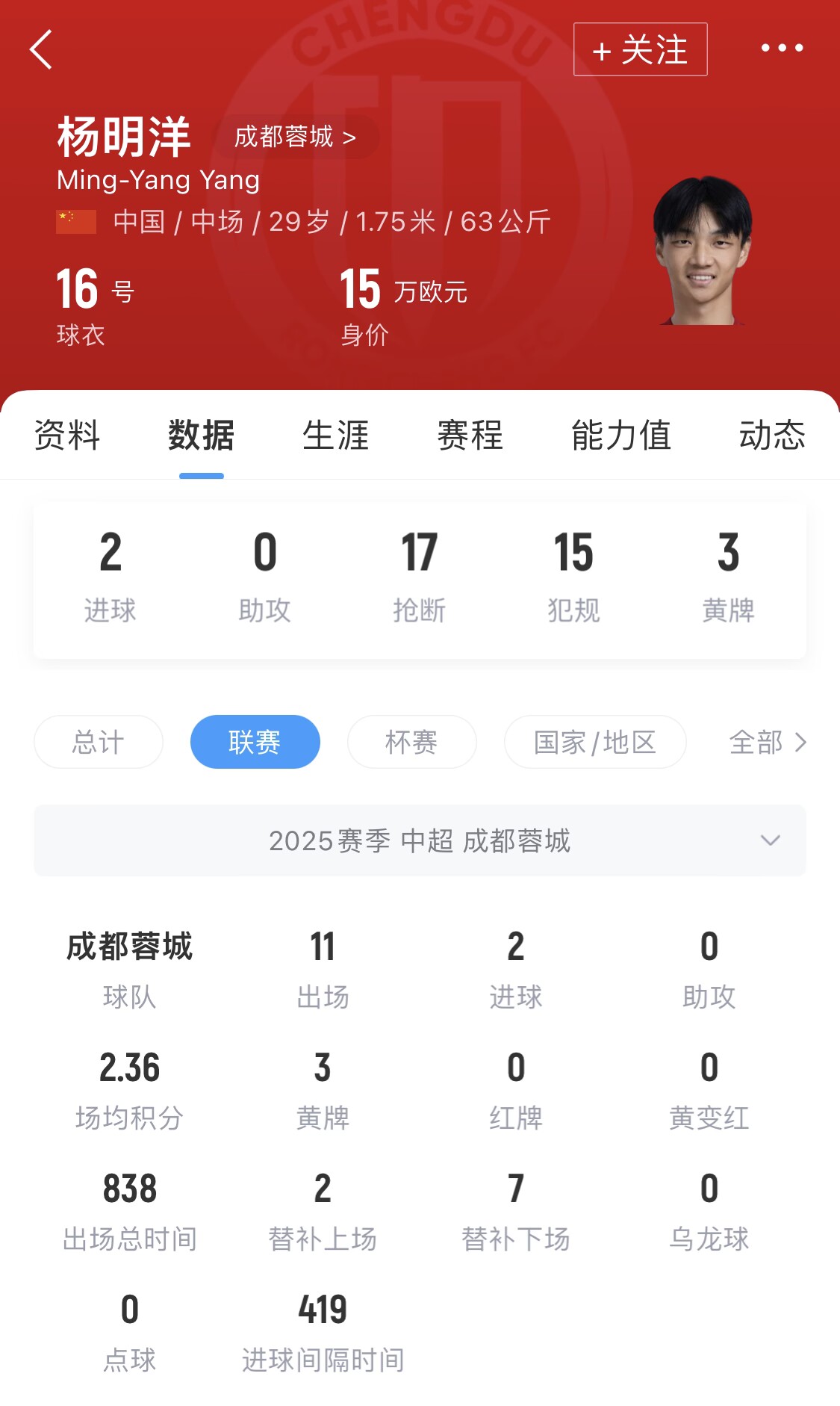 05月12日讯 成都蓉城中场杨明洋连续两轮联赛进球,据北青体育肖赧报道,他表现引起国足关注。