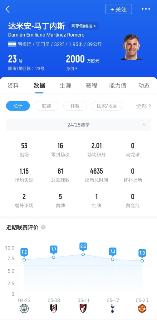 大马丁,现年32岁,2020年以1740万欧转会费从阿森纳加盟维拉,目前他已经为维拉出战212场比赛,丢掉256球,完成70场零封,德转身价2000万欧。