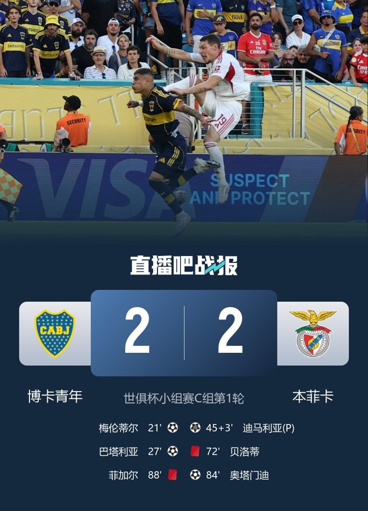 6月17日讯 北京时间6月17日6时,世俱杯小组赛C组第1轮,博卡青年在硬石体育场对阵本菲卡。上半场,埃雷拉伤退,随后埃雷拉在替补席上抗议裁判领到红牌,梅伦蒂尔首开纪录,巴塔利亚扩大领先优势,迪马利亚点射扳回一城。博卡青年半场2-1领先本菲卡。下半场,贝洛蒂抬脚过高踢到对方头部领到红牌,随后奥塔门迪扳平比分,菲加尔恶意犯规也被红牌罚下。最终博卡青年2-2战平本菲卡。