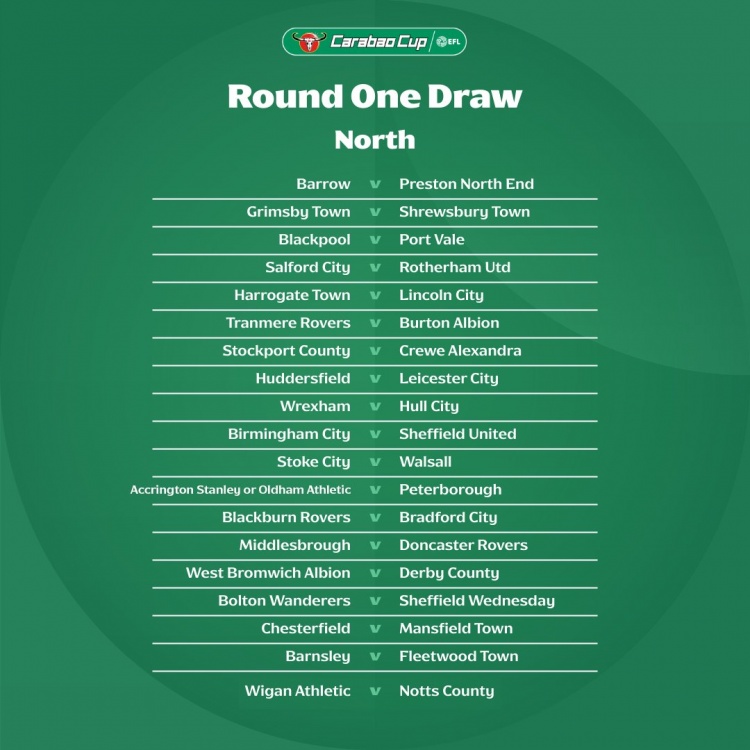 预赛同样分地区进行,阿克灵顿对阵奥尔德姆,巴尼特对阵纽波特郡。此外,九支参加新赛季欧战的英超球队将从第三轮开踢。