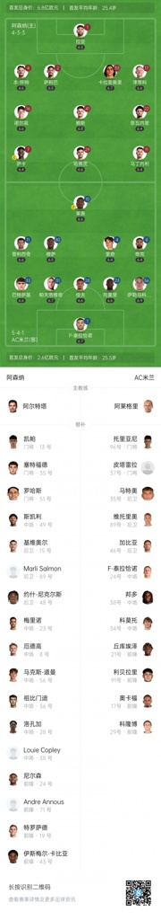 阿森纳首发:1-拉亚、2-萨利巴、4-本-怀特、17-津琴科、33-卡拉菲奥里、29-哈弗茨、41-赖斯、16-诺尔高、22-恩瓦内里、7-萨卡、11-马丁内利