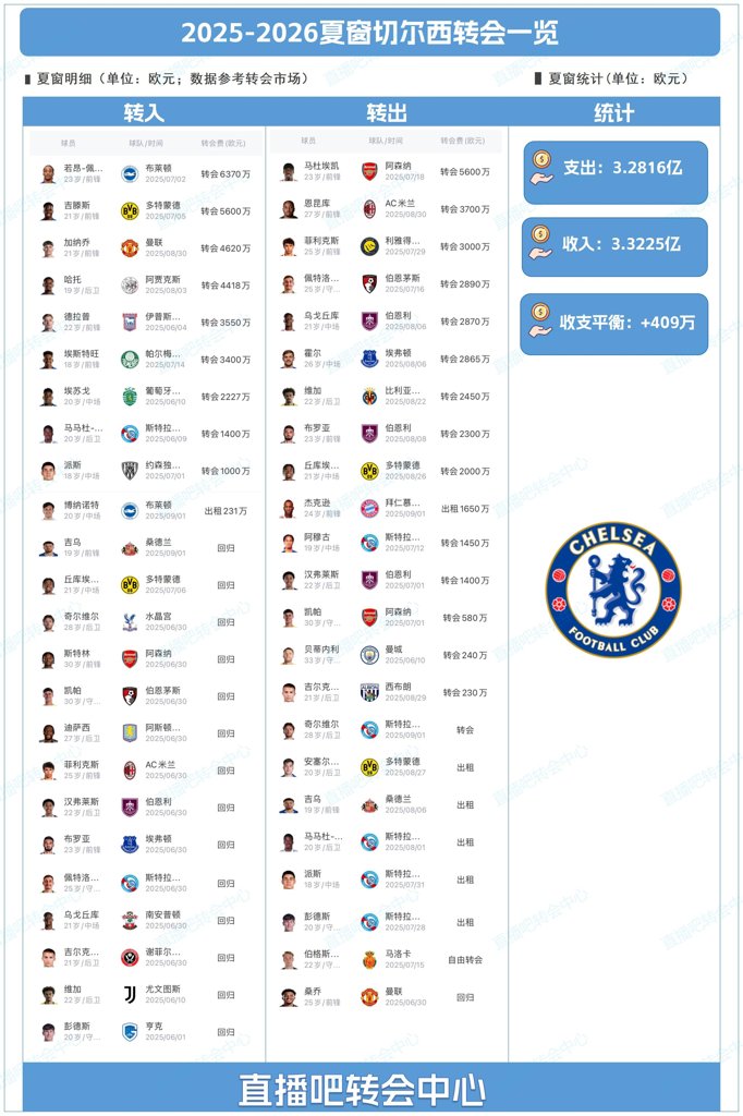 砸3.3亿还有赚!TA:切尔西夏窗大获成功,提升阵容深度&还有资金