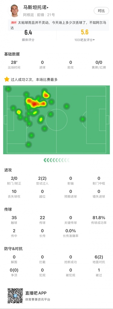 阿根廷10号太沉重!马斯坦托诺仅获6.4分,2射0正2过人10次丢球权